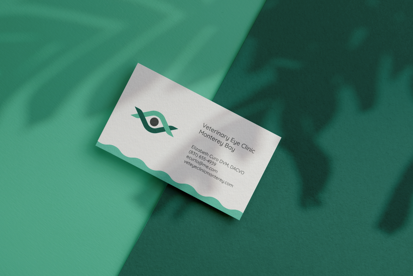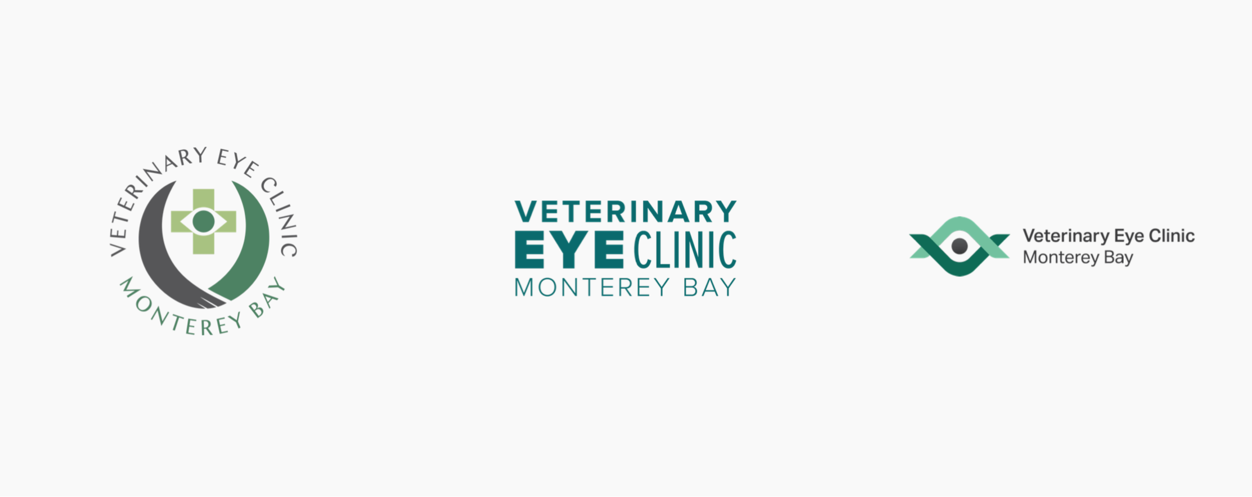 The client was presented with three logo options, each of them reflecting the qualities they wanted their brand to elicit but with the primary focus on different parts of those qualities. The first option focused on empathy and featured an eye and medical cross, and animals holding hands and forming a “V”. The second option’s emphasis was on approachability, and featured variable typography meant to resemble an eye chart. The final option focused on approachability, with two “V” shapes that form an eye but also resemble people hugging (compassion), and the waves of Monterey Bay. The client chose the third option with minor refinements in the second round.